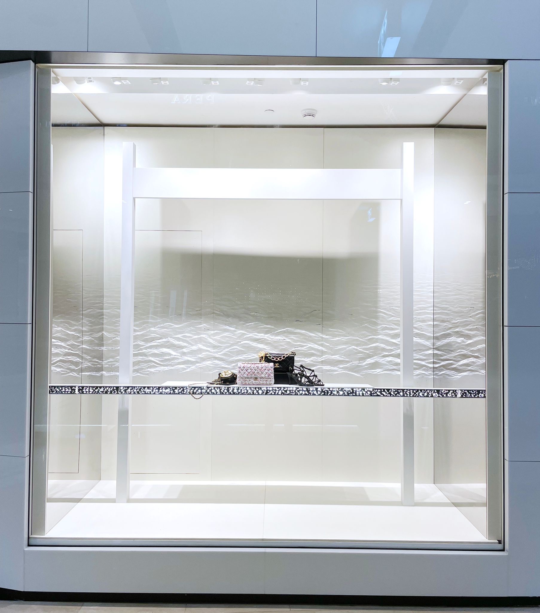 The wave walls read as landscapes with surface carving establishing a precise topography, but it is the finishing sequence that activates the window: successive coats of pigment, metallic suspensions, foils, glazes, varnish and particulate mica turn the surface into a calibrated light instrument, shifting from flat plane to depth.