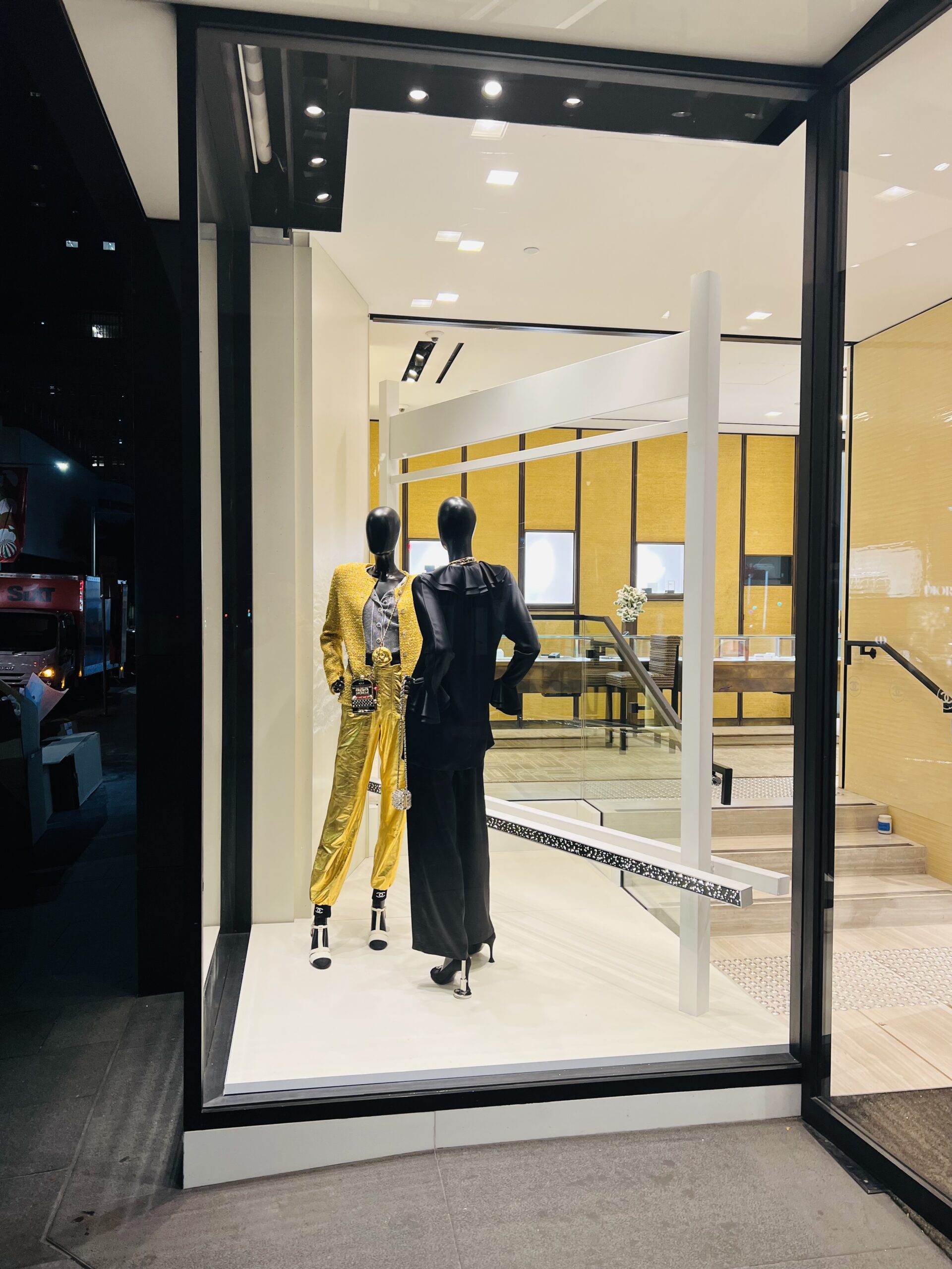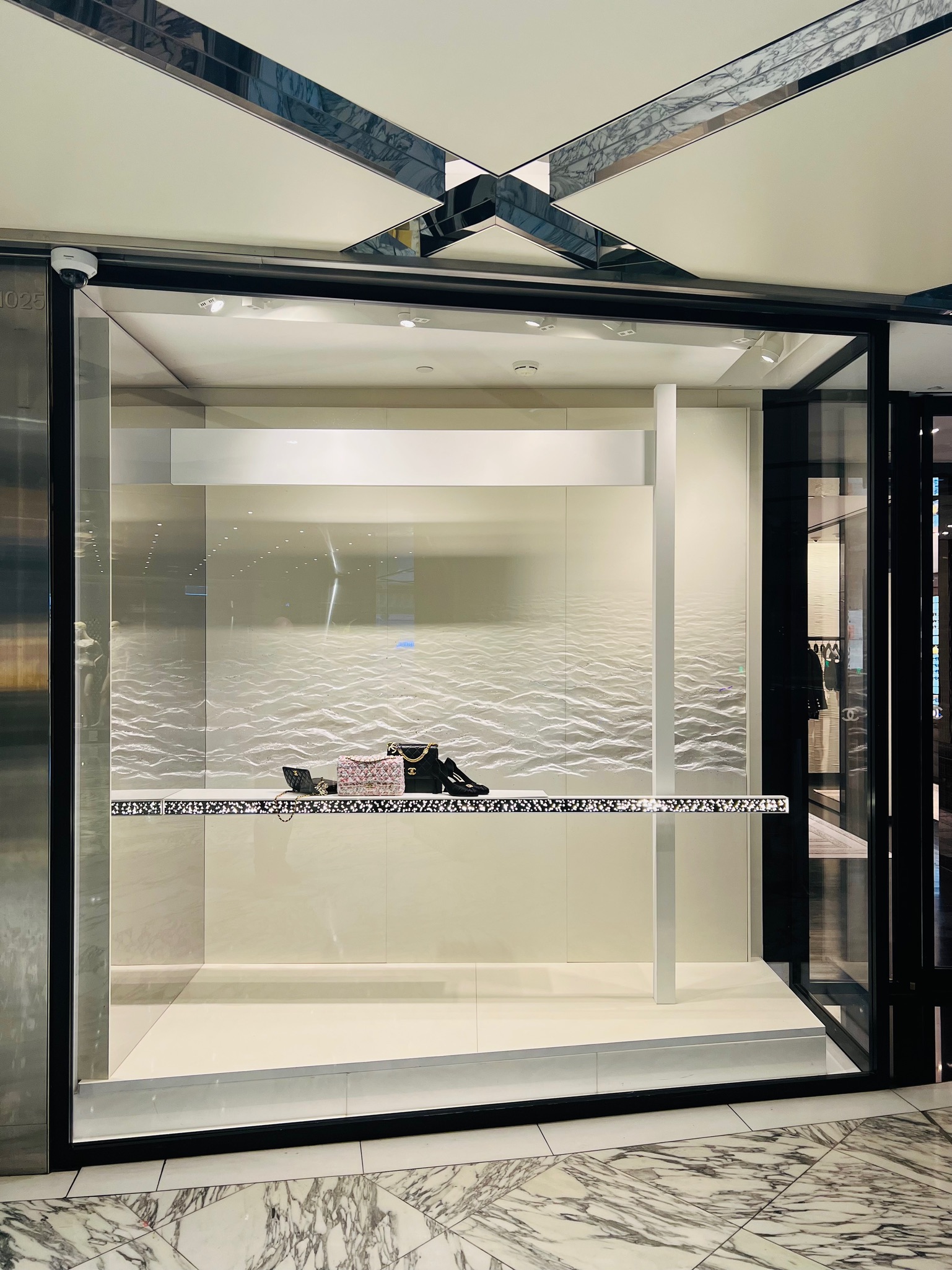 The architecture of the window becomes a frame for this single act of surface, where structure, image and atmosphere collapse into one worked skin.