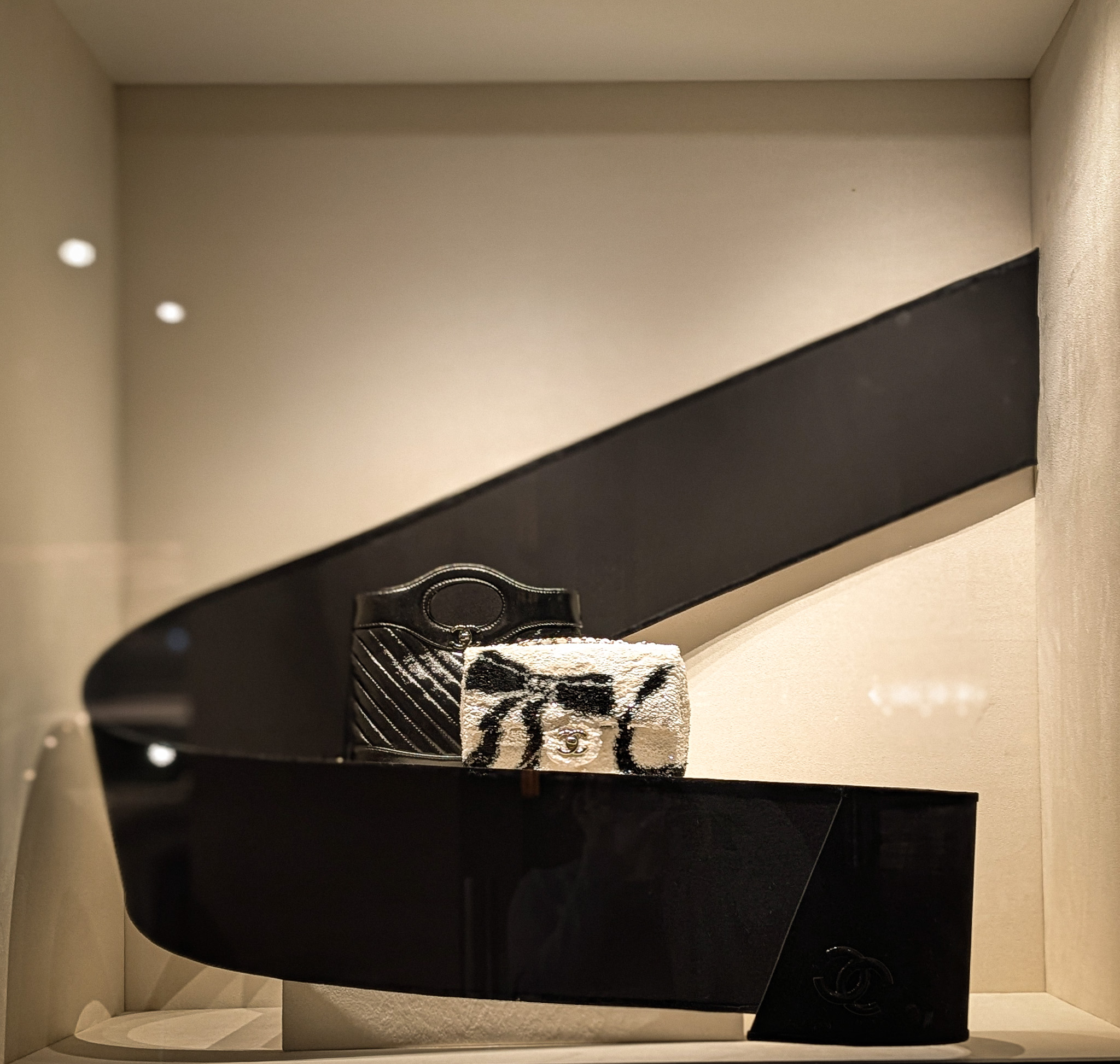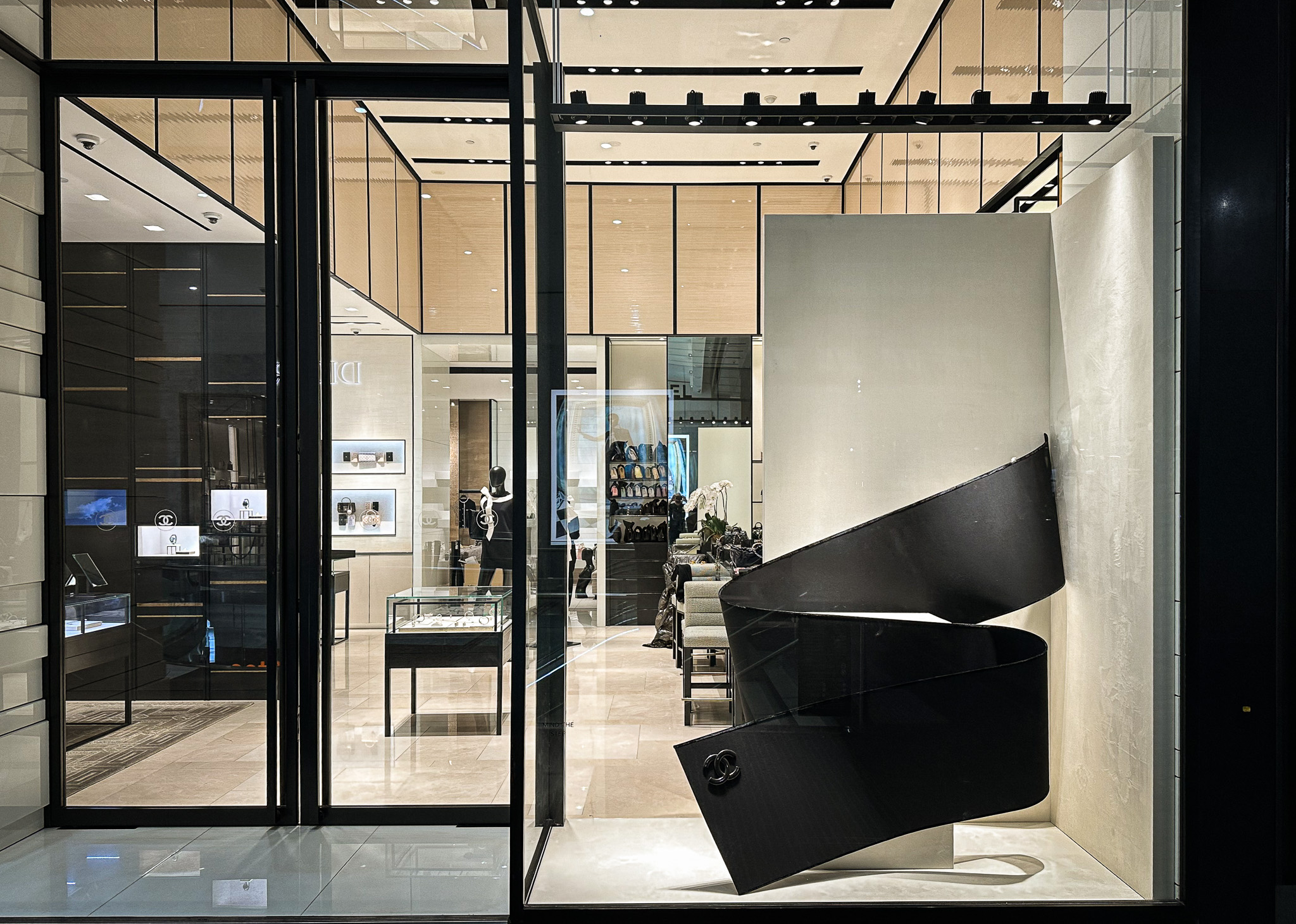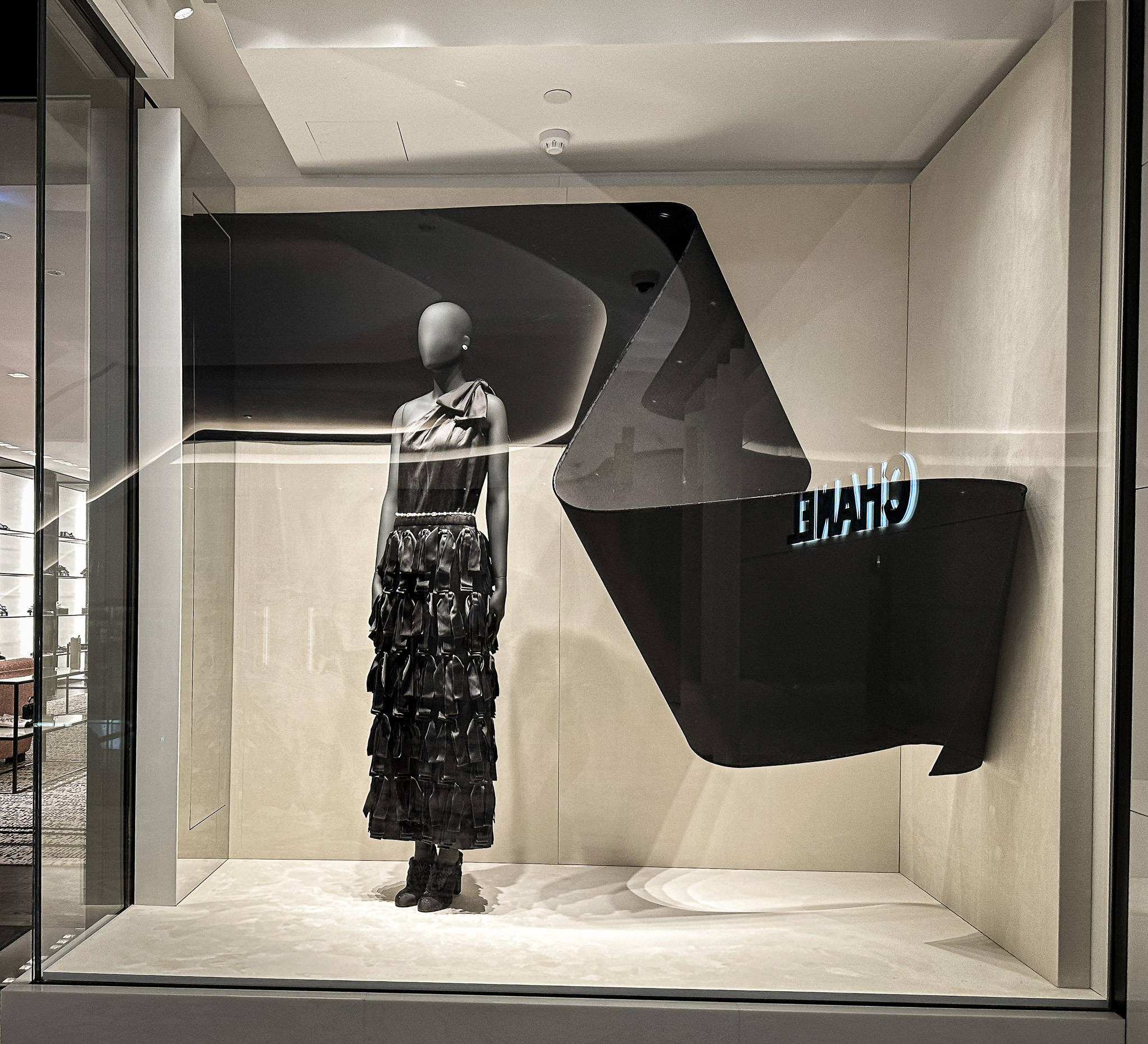 The Chanel “25K” window concept extends the runway’s sculptural black ribbon into architectural form.
