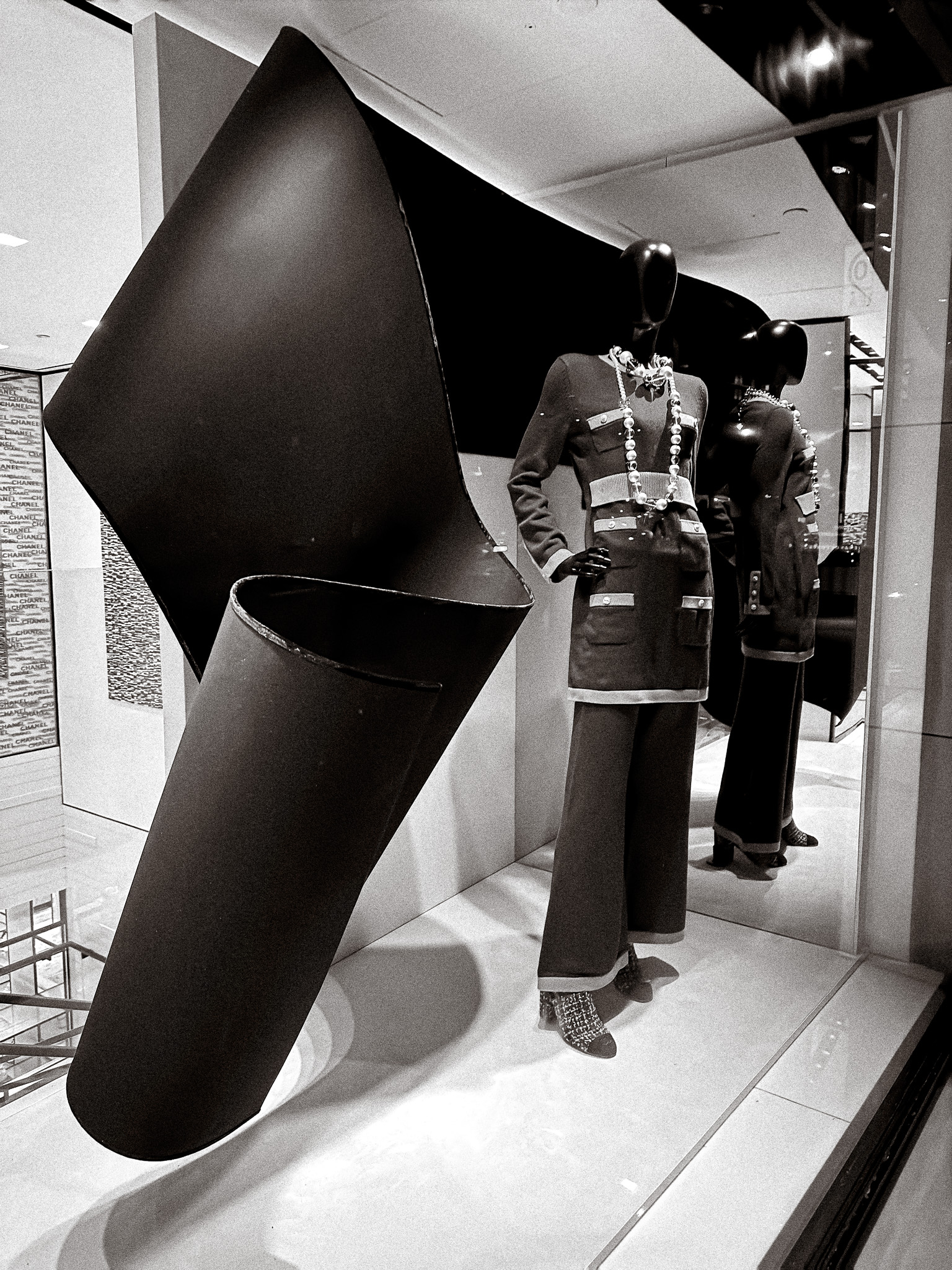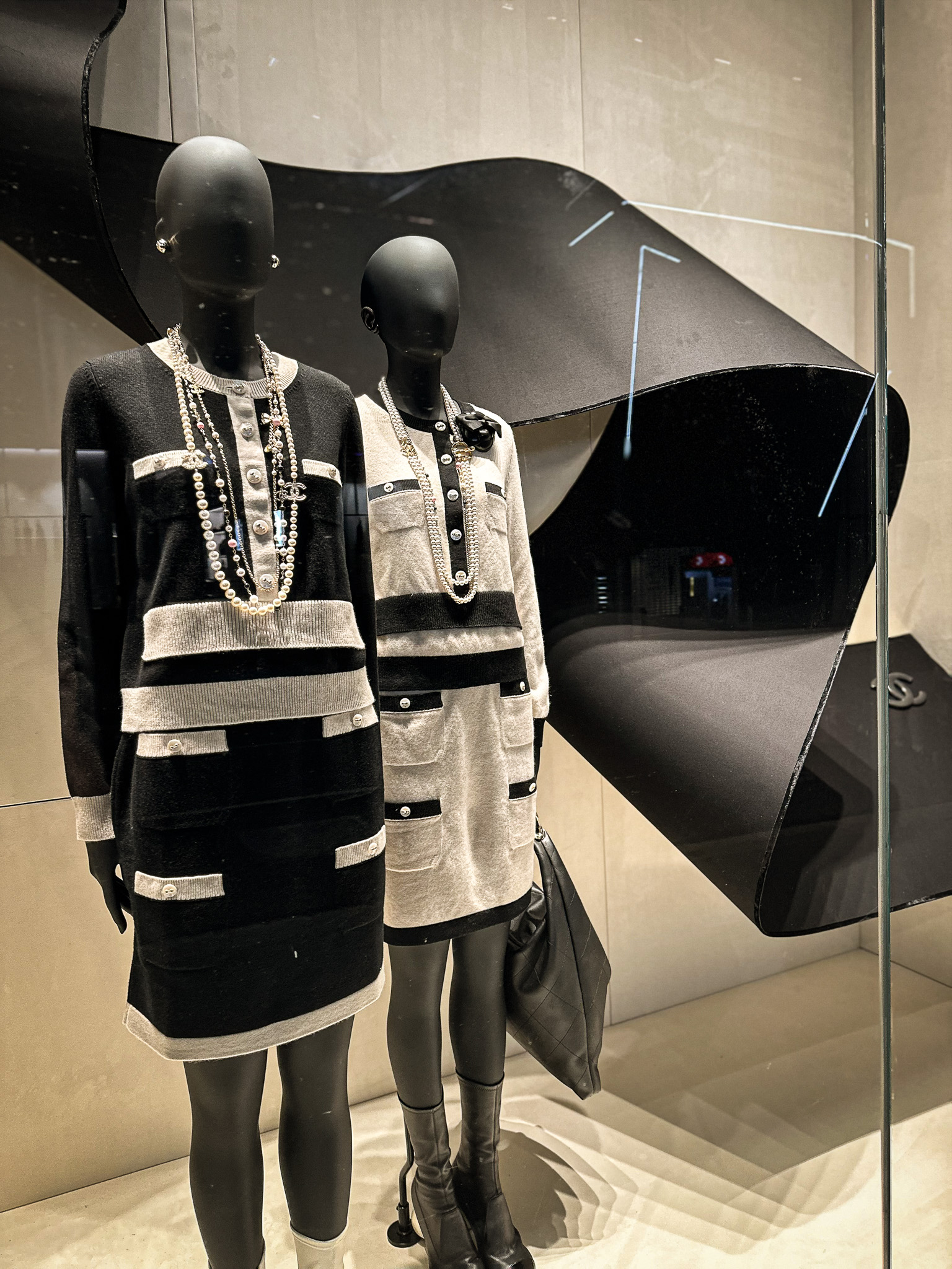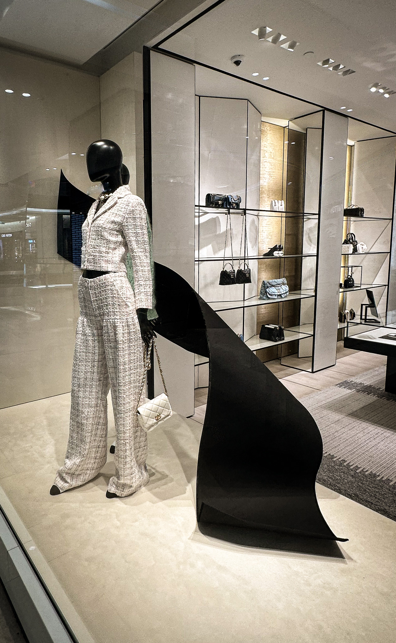 The Chanel “25K” window concept extends the runway’s sculptural black ribbon into architectural form.